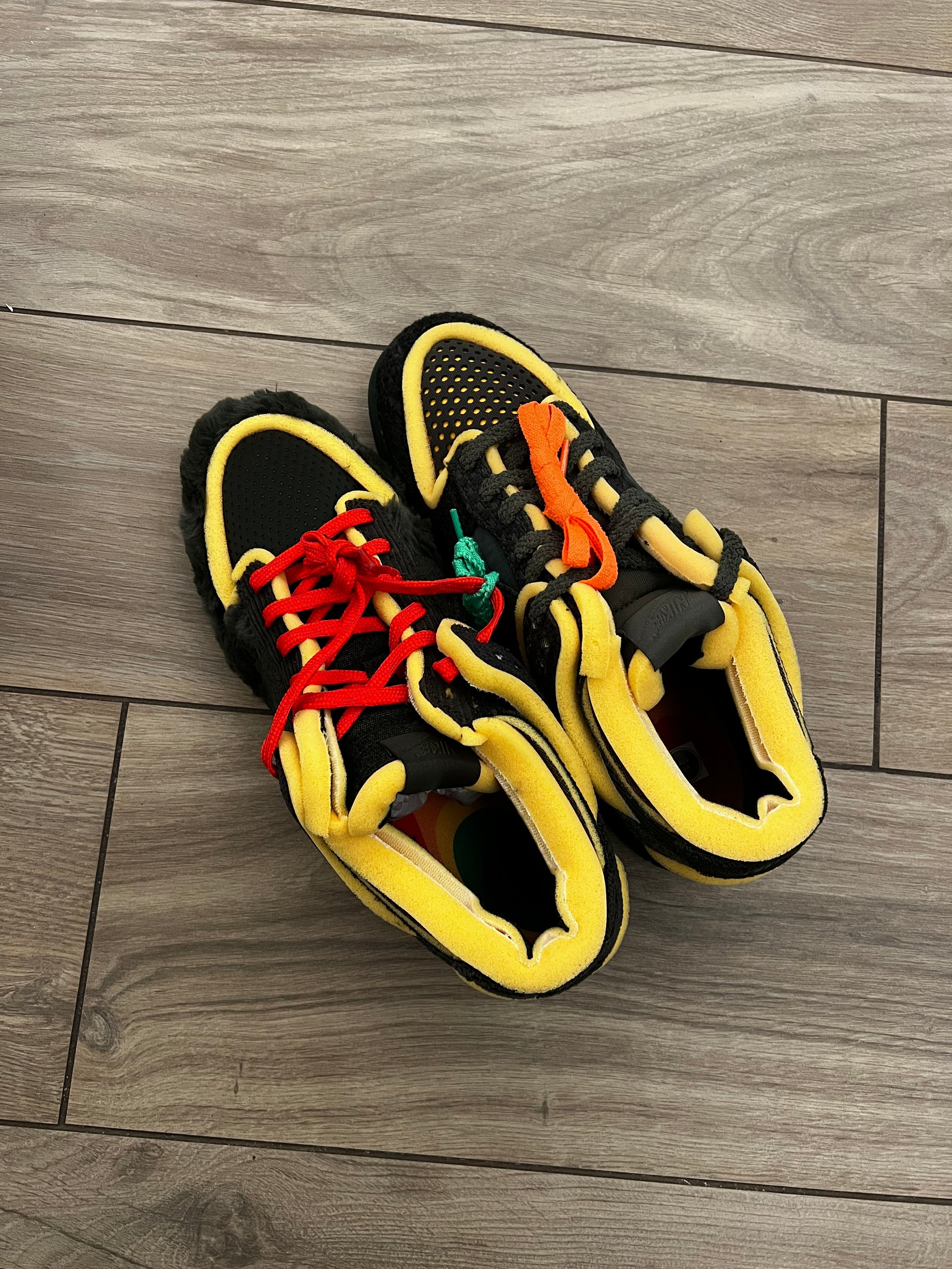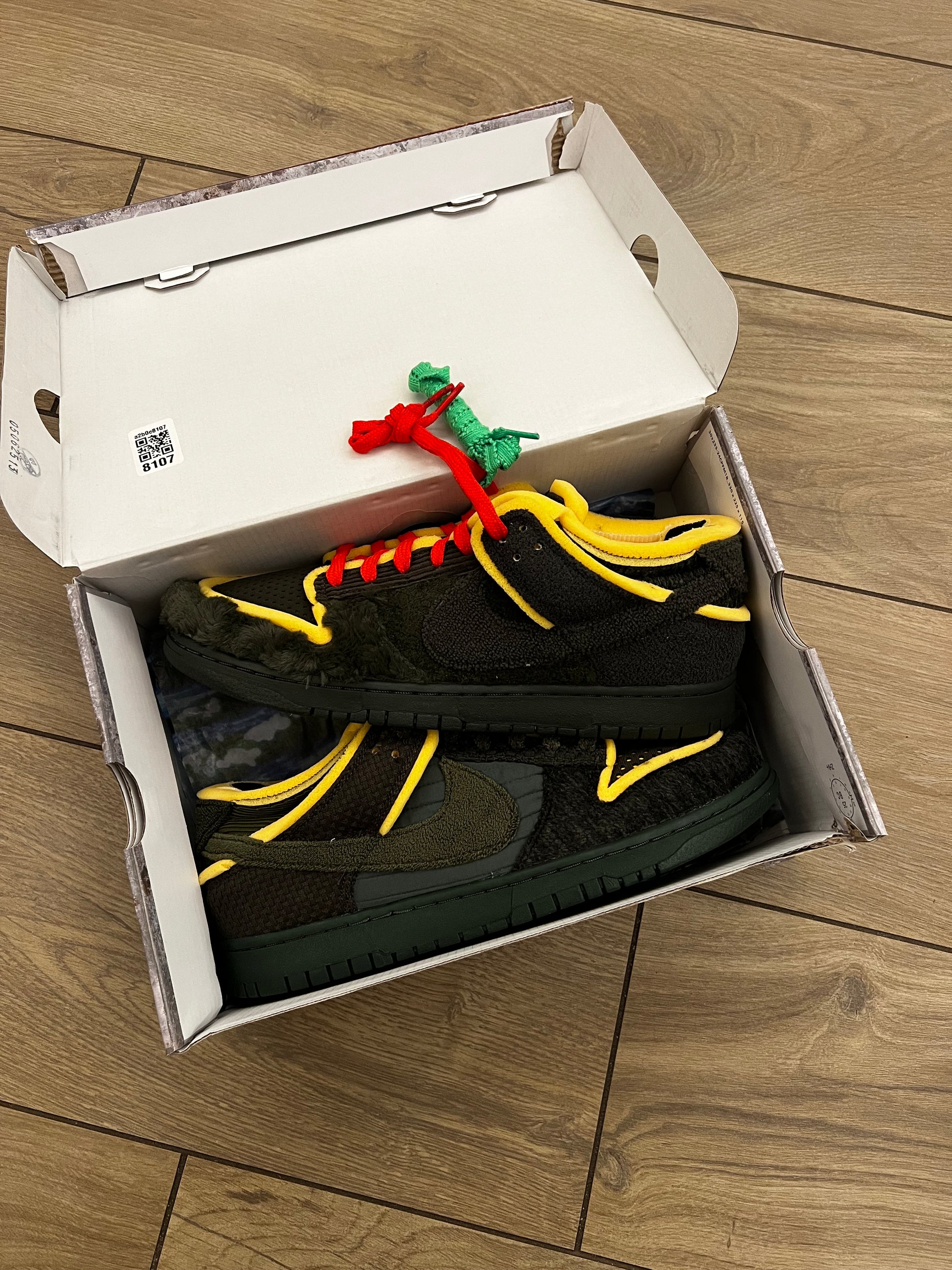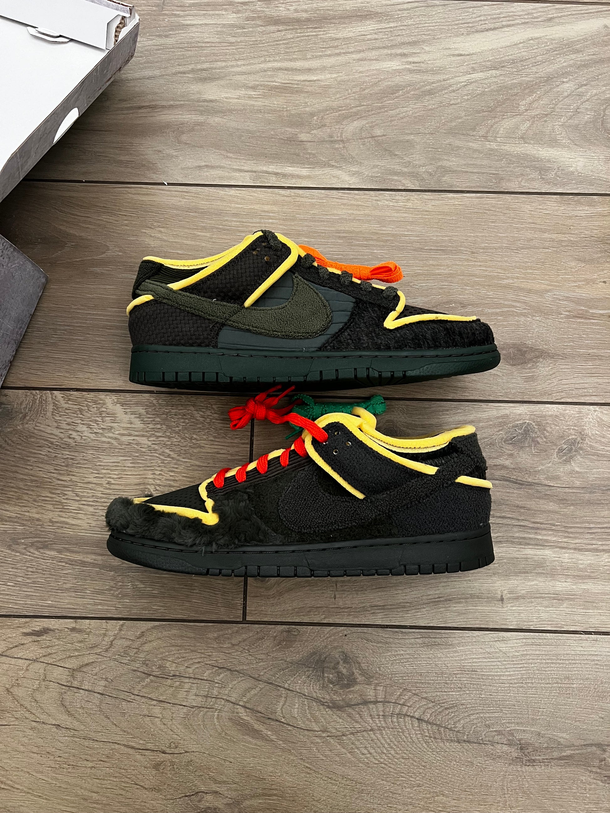 Il modello Cactus Plant Flea Market x Nike Dunk Low “Sequoia”, parte del pack “Swamp Sponge” composto da tre varianti, dona alla silhouette rétro un look rinnovato con materiali misti. A differenza delle altre colorazioni, questa versione presenta una palette sobria in tonalità di verde scuro. La costruzione asimmetrica tra la scarpa sinistra e quella destra combina tessuto, pelliccia sintetica, velluto a coste e spugna. Dettagli comuni includono la schiuma gialla a vista su ogni pannello, linguetta e collarino, oltre a una suola cupsole in gomma verde foresta.