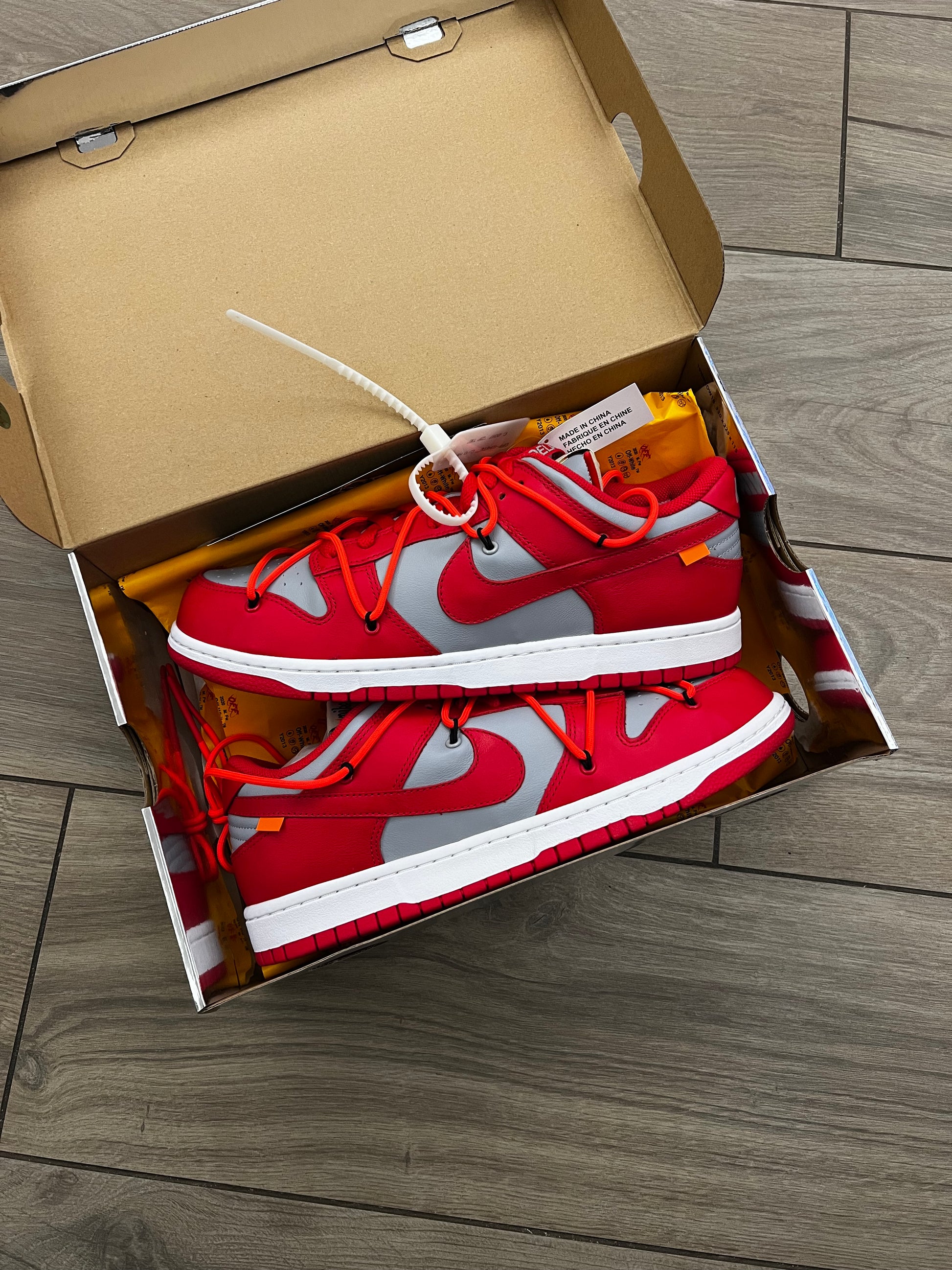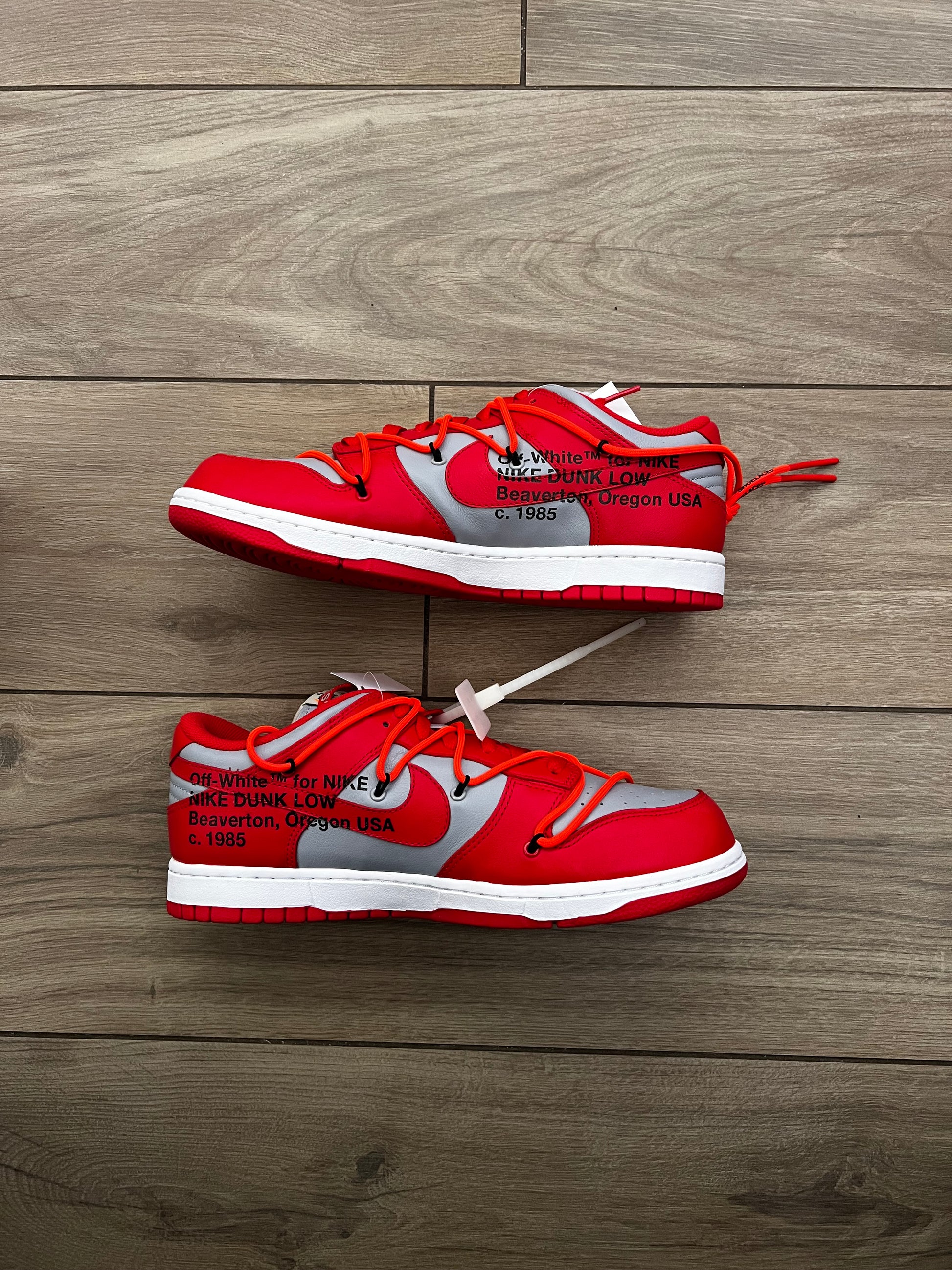 La collezione Off-White x Nike Dunk Low si ispira a temi di frammentazione e ricostruzione. Presentata a dicembre 2019, questa versione in pelle University Red e grigia include dettagli di branding rétro, una grafica testuale ingrandita sul lato mediale e il caratteristico Swoosh con etichetta sulla parte laterale. Abloh esprime il suo stile decostruttivista con la schiuma della linguetta a vista, un tallone flottante e un sistema di lacci secondario. La sneaker è completata da una suola cupsole in gomma bicolore.