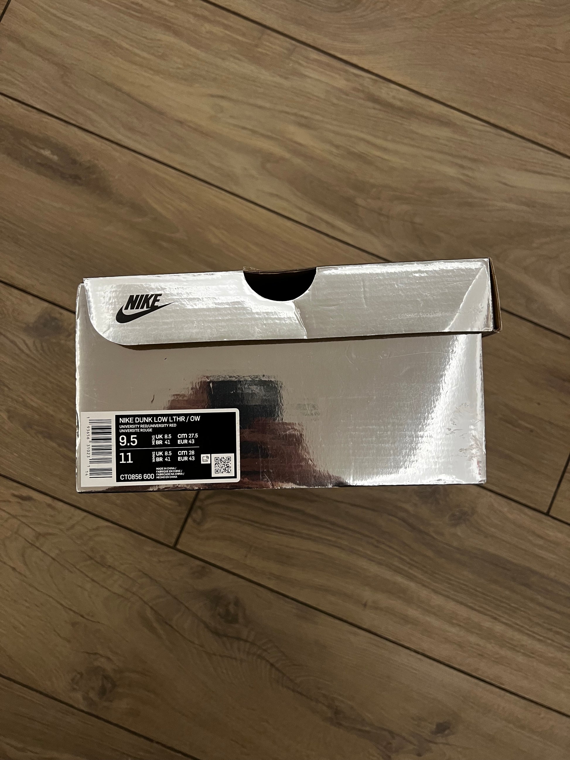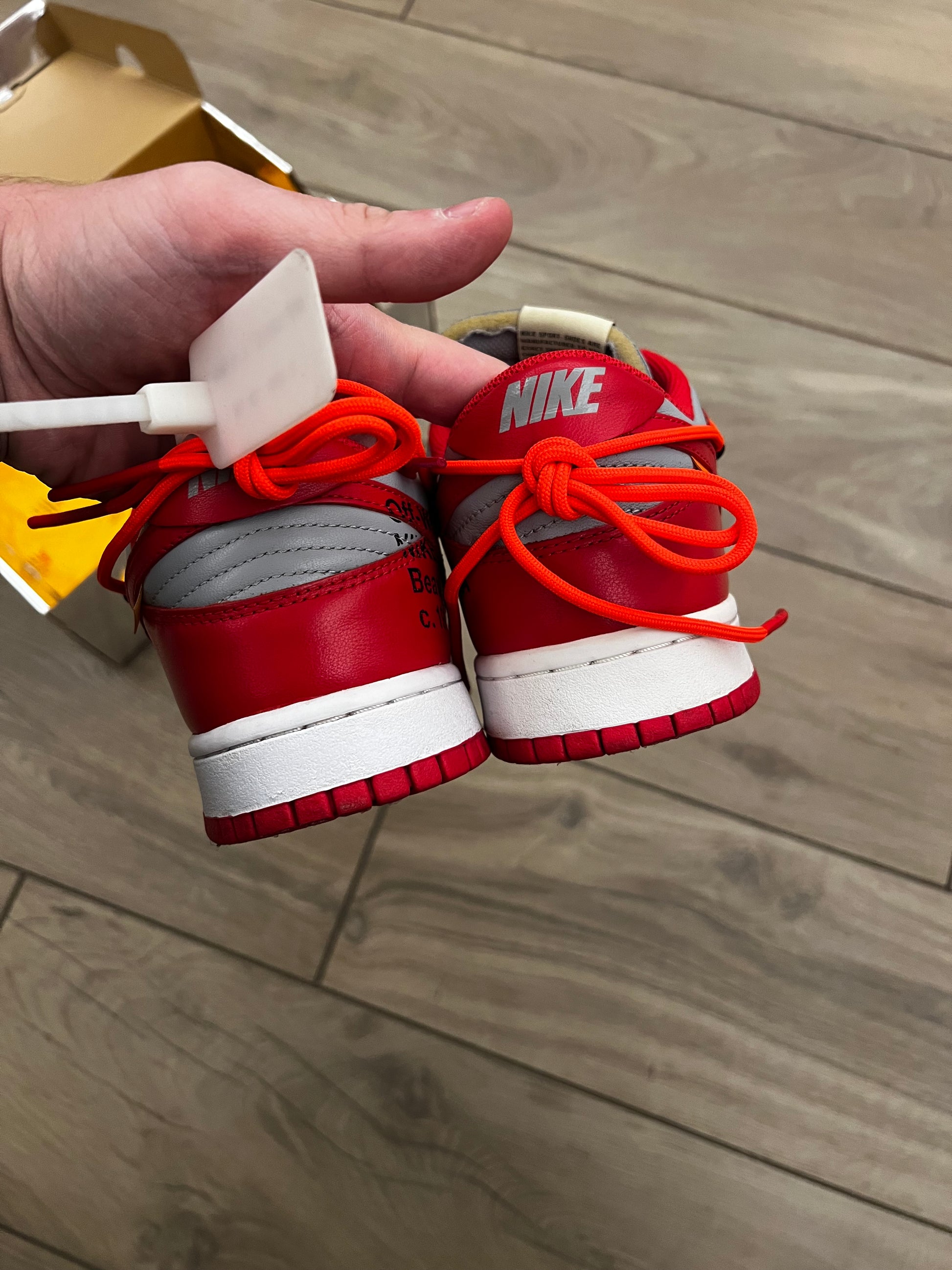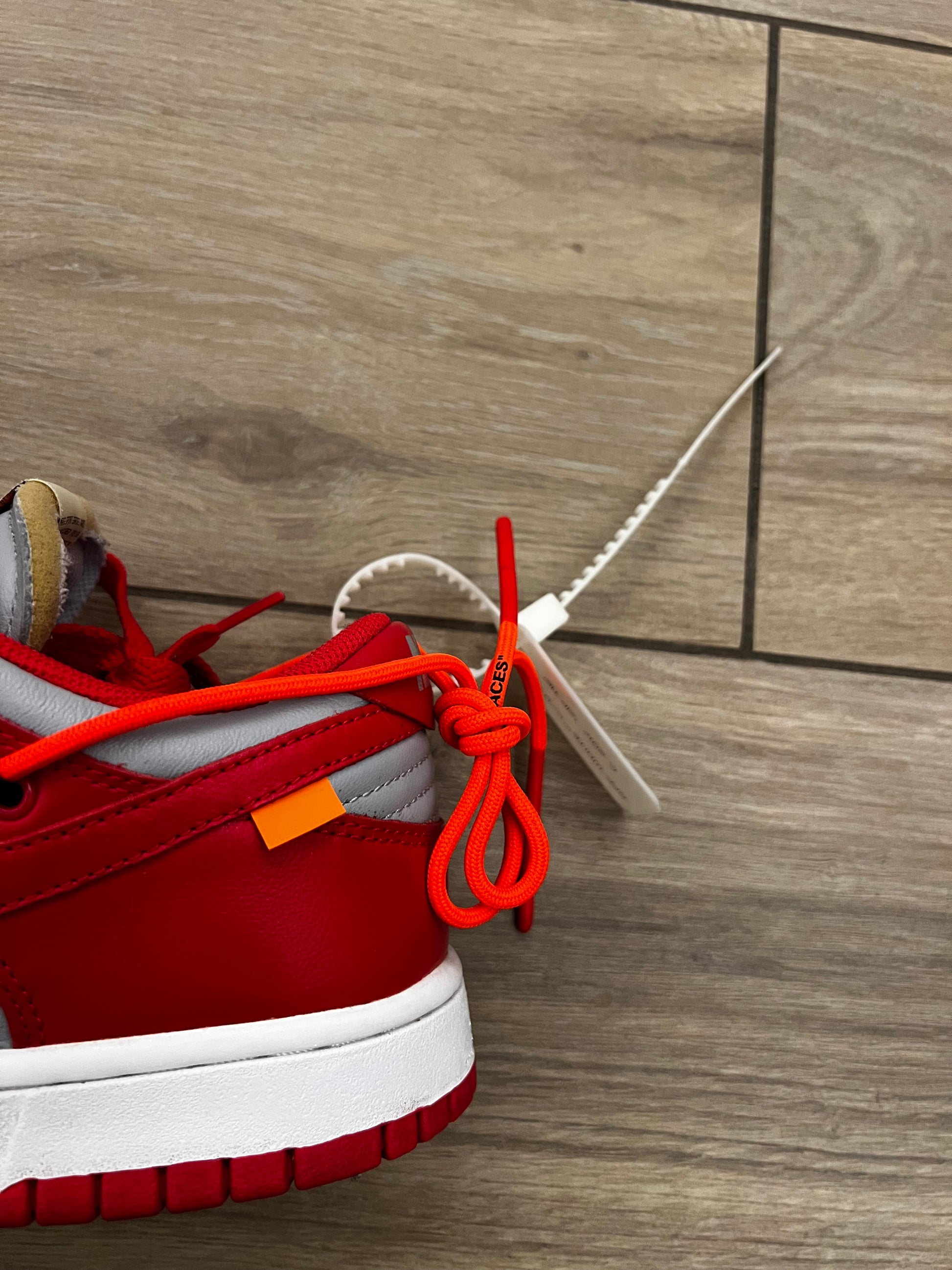 La collezione Off-White x Nike Dunk Low si ispira a temi di frammentazione e ricostruzione. Presentata a dicembre 2019, questa versione in pelle University Red e grigia include dettagli di branding rétro, una grafica testuale ingrandita sul lato mediale e il caratteristico Swoosh con etichetta sulla parte laterale. Abloh esprime il suo stile decostruttivista con la schiuma della linguetta a vista, un tallone flottante e un sistema di lacci secondario. La sneaker è completata da una suola cupsole in gomma bicolore.