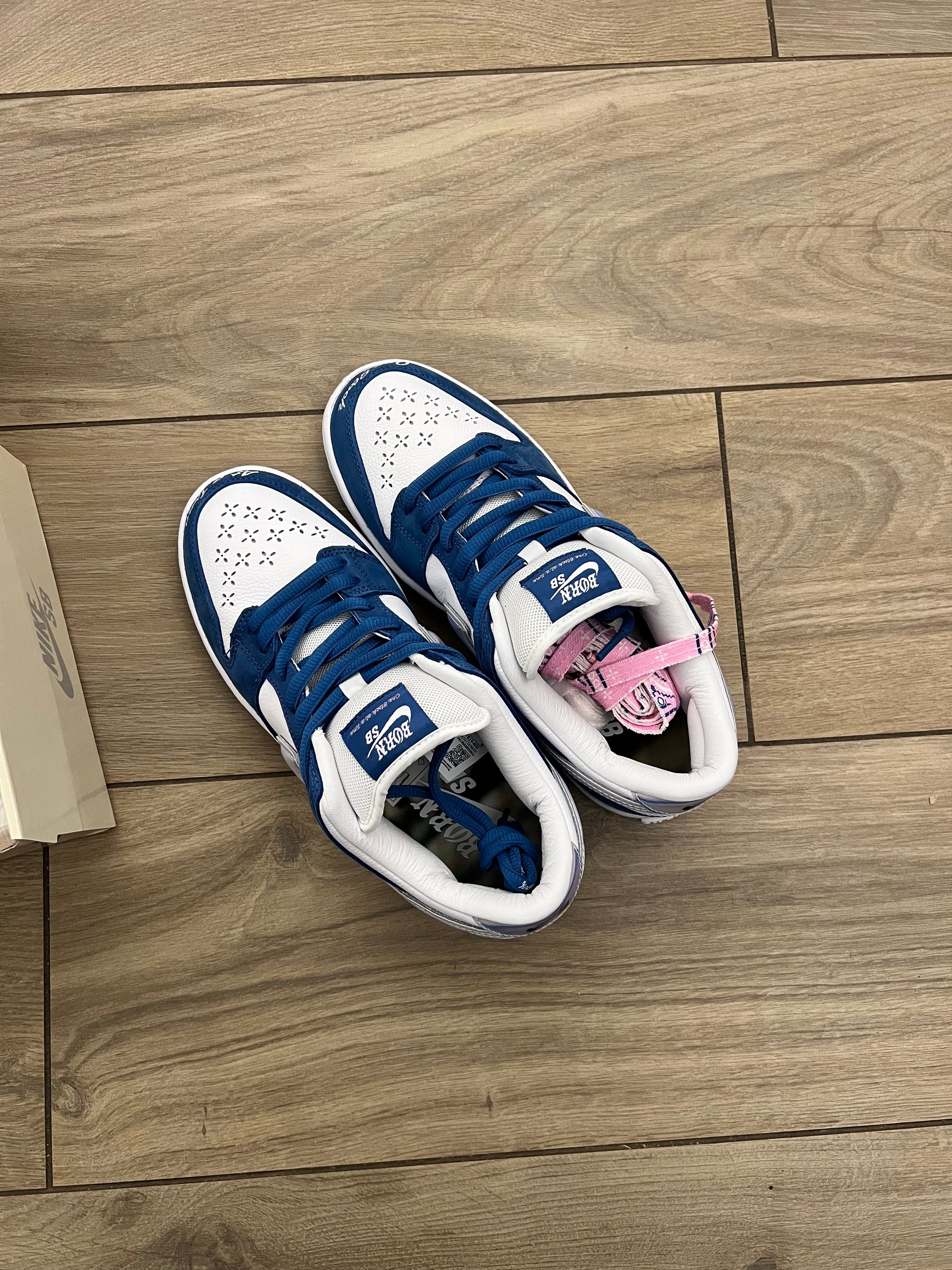 Le Born x Raised x Nike Dunk Low SB ‘One Block at a Time’ introducono una serie di dettagli unici alla silhouette classica. Il brand streetwear di Los Angeles veste la tomaia con pelle bianca testurizzata, arricchita da perforazioni decorative sulla punta e inserti in nabuk blu Dodger a contrasto. La scritta ‘One Block at a Time’ è incisa sulla punta di ciascuna scarpa, mentre un emblema decorativo ricamato in rosa adorna il tallone laterale. Un effetto olografico dona vivacità allo Swoosh e al pannello posteriore, contrassegnato da un logo lenticolare Born SB. La sneaker poggia su un’intersuola in gomma bianca, con la scritta in rilievo ‘On the Turf’ sul tallone. Sotto, la suola in gomma blu semi-trasparente rivela un maxi logo Born SB.