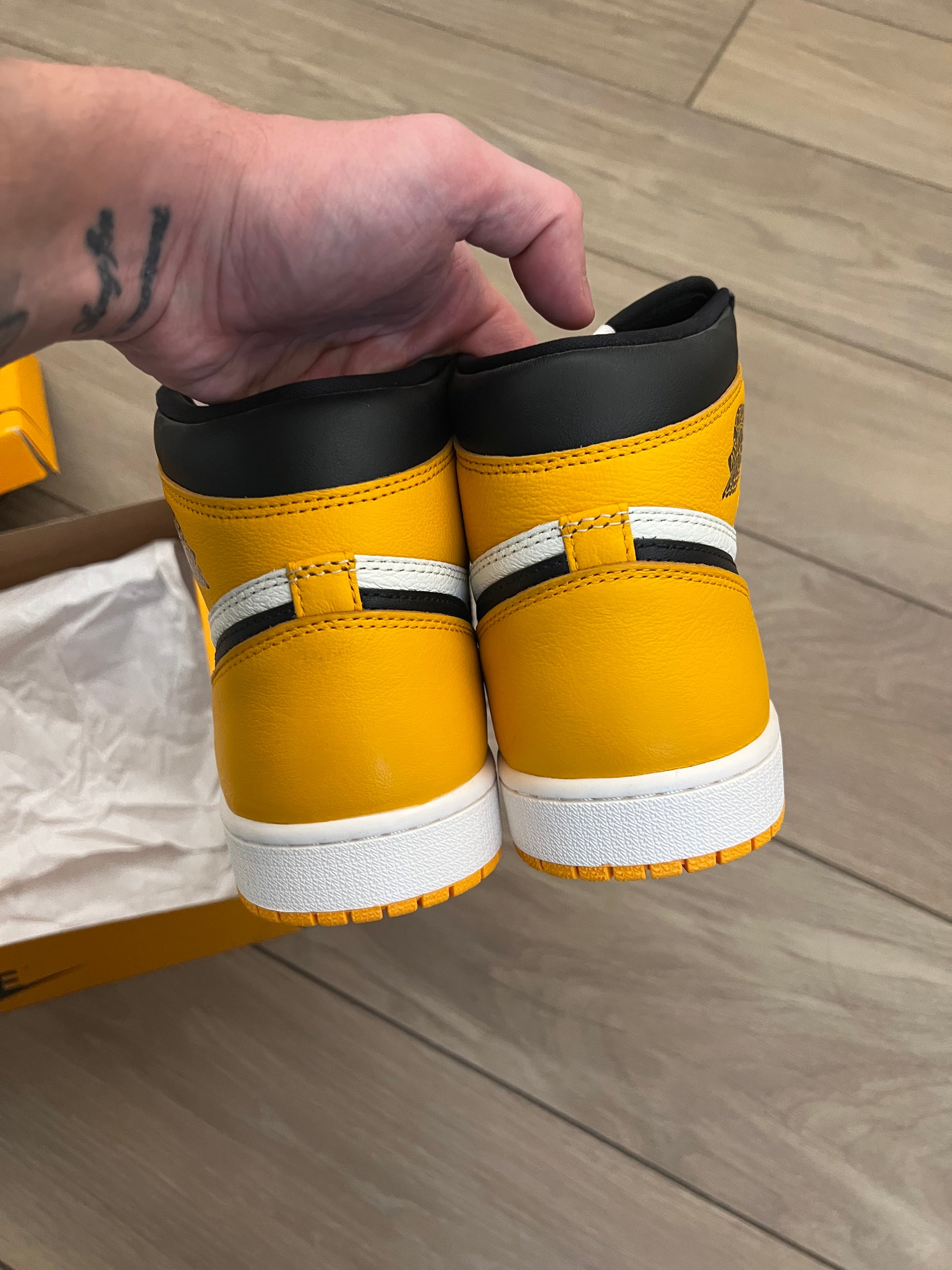 Le Air Jordan 1 Retro High OG “Yellow Toe”, note anche come “Taxi”, ripropongono il caratteristico color blocking delle AJ1 “Bred Toe” del 2018. La tomaia interamente in pelle combina un pannello laterale bianco con una punta gialla, un overlay sull’avampiede nero e il classico Swoosh nero. Ulteriori dettagli color ambra compaiono sull’overlay del tallone e sulla patta del collarino, con il logo Wings in stile retrò stampato sul lato laterale. Un’etichetta Nike Air intrecciata impreziosisce la linguetta in nylon nero. La sneaker high-top poggia su una resistente suola a coppa in gomma, caratterizzata da fianchi bianchi e una suola esterna in gomma gialla.