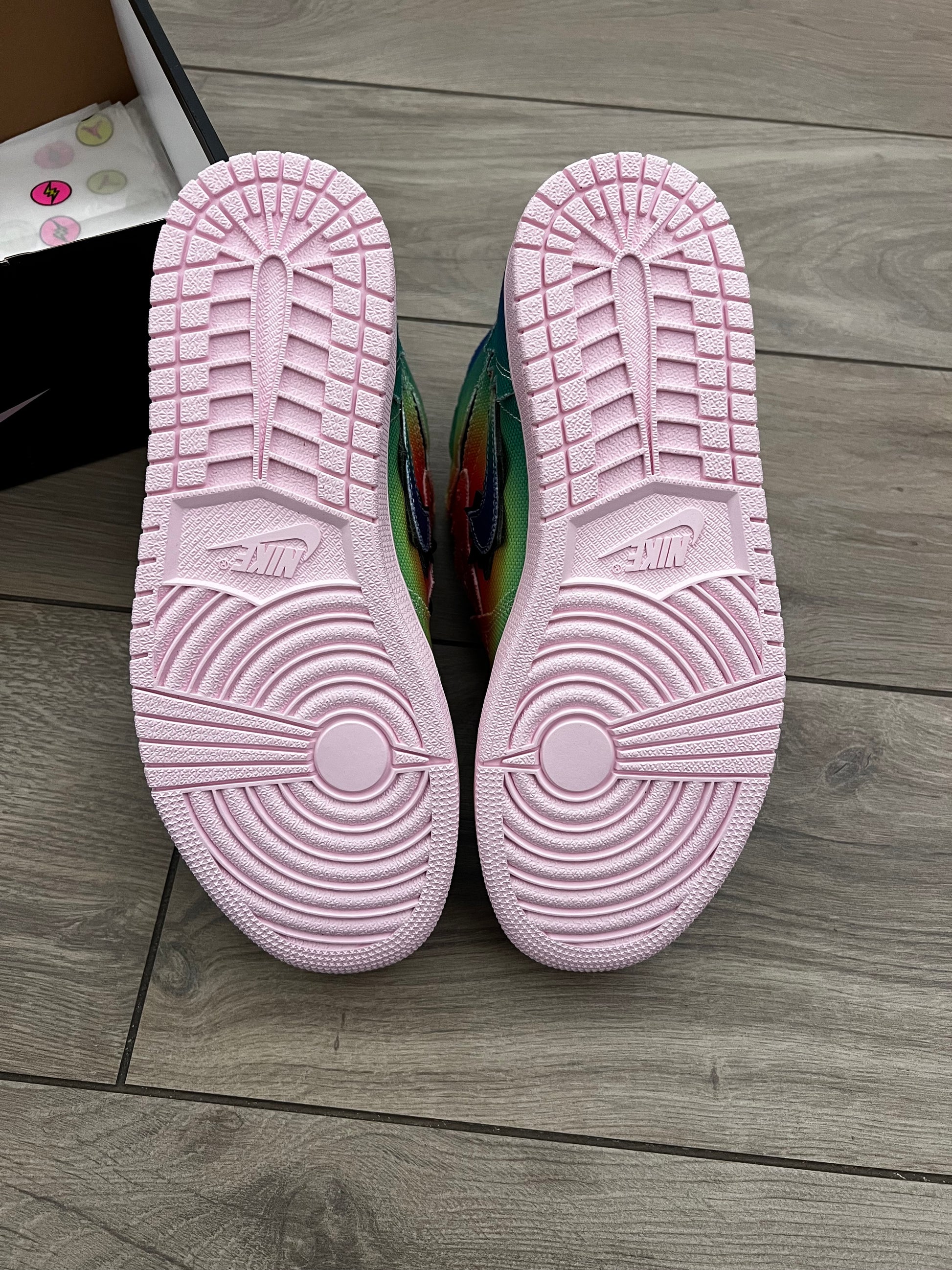 Sviluppato in collaborazione con il cantante reggaeton, la J. Balvin x Air Jordan 1 Retro OG High “Colores Y Vibras” dona alla classica sneaker un restyling colorato, caratterizzato da una tomaia in tessuto con bordi grezzi per un’estetica fai-da-te. La combinazione cromatica prismatica è completata da tonalità rosa pastello sulla linguetta con schiuma a vista e sulla suola in gomma, mentre il collarino, i lacci e il logo Wings modificato sono realizzati in nero. Patch in Velcro rimovibili sul tallone laterale offrono la possibilità di scegliere tra un pallone da basket, la faccina sorridente tipica di J Balvin o l’icona Jumpman.
